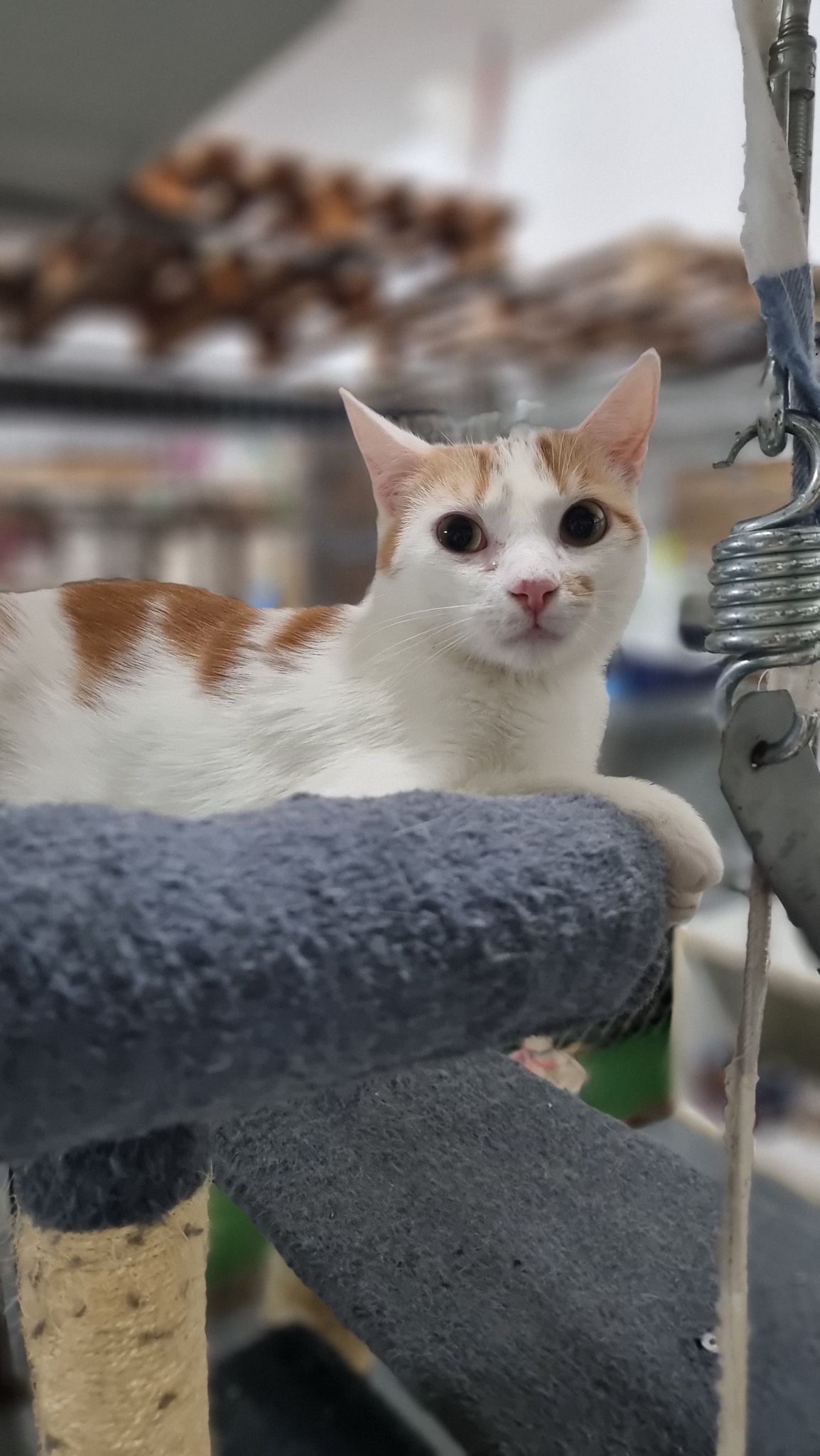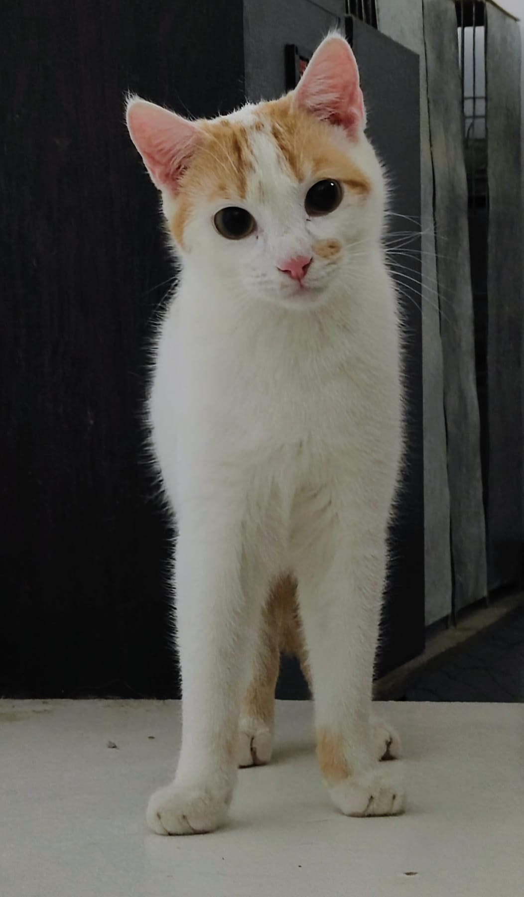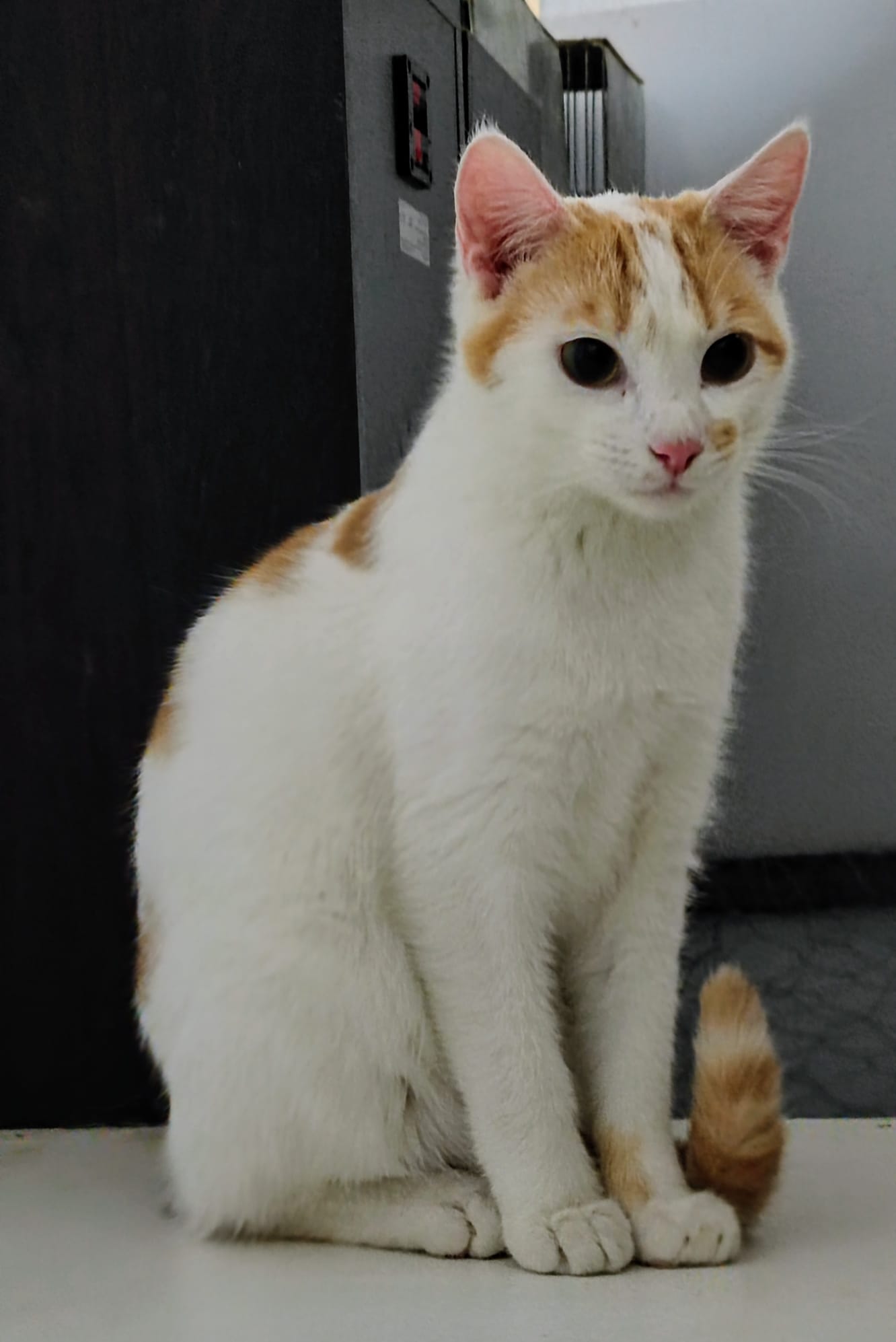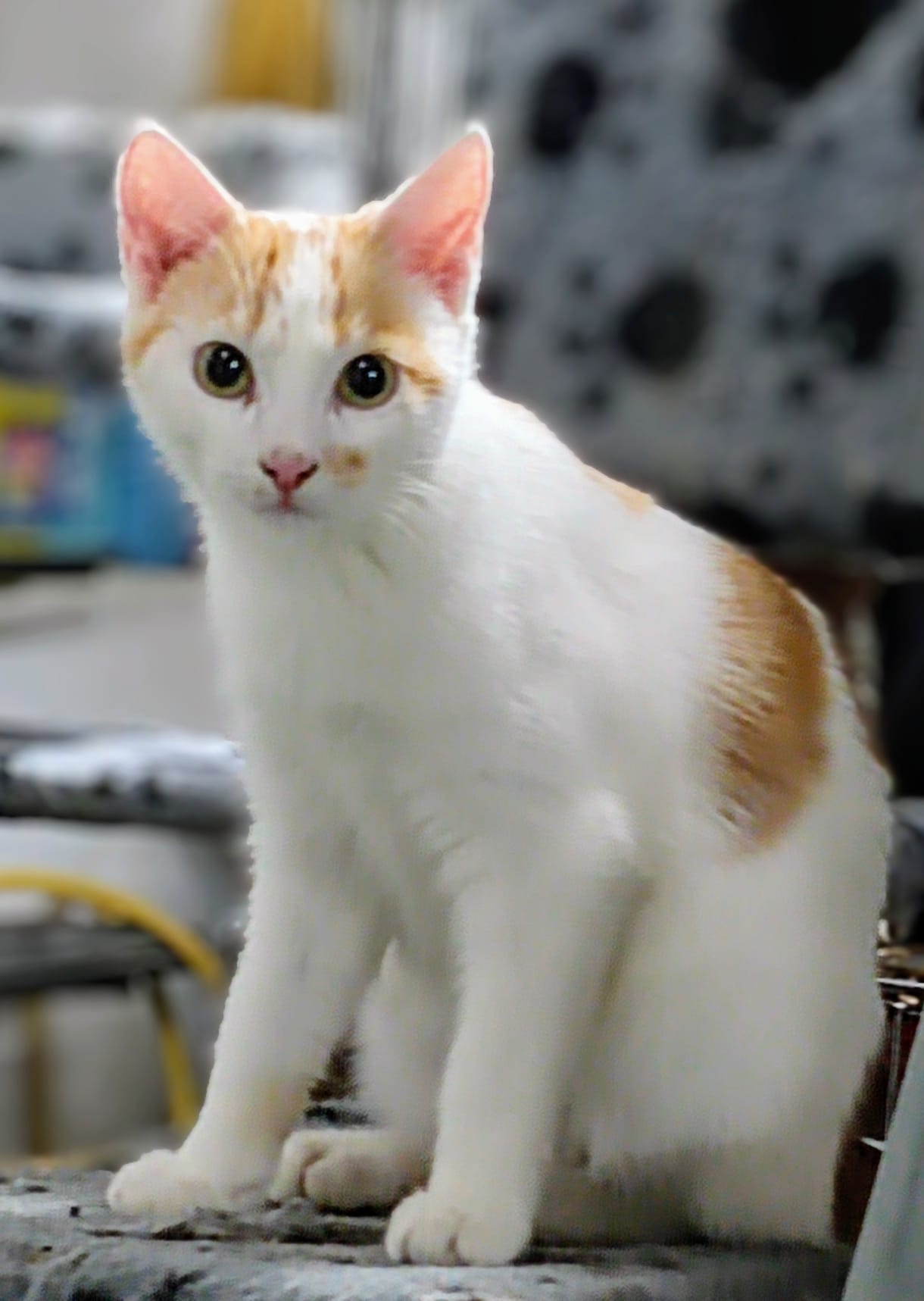 Juan es un gato tímido y muy tranquilo. Cariñoso con humanos y otros gatos. Fue rescatado de la calle siendo un bebé . Sin nadie que le cuidara estaba sucio y delgados pero ahora es un bellezon. Su pelo es de un blanco inmaculado con pequeños toques naranjas.